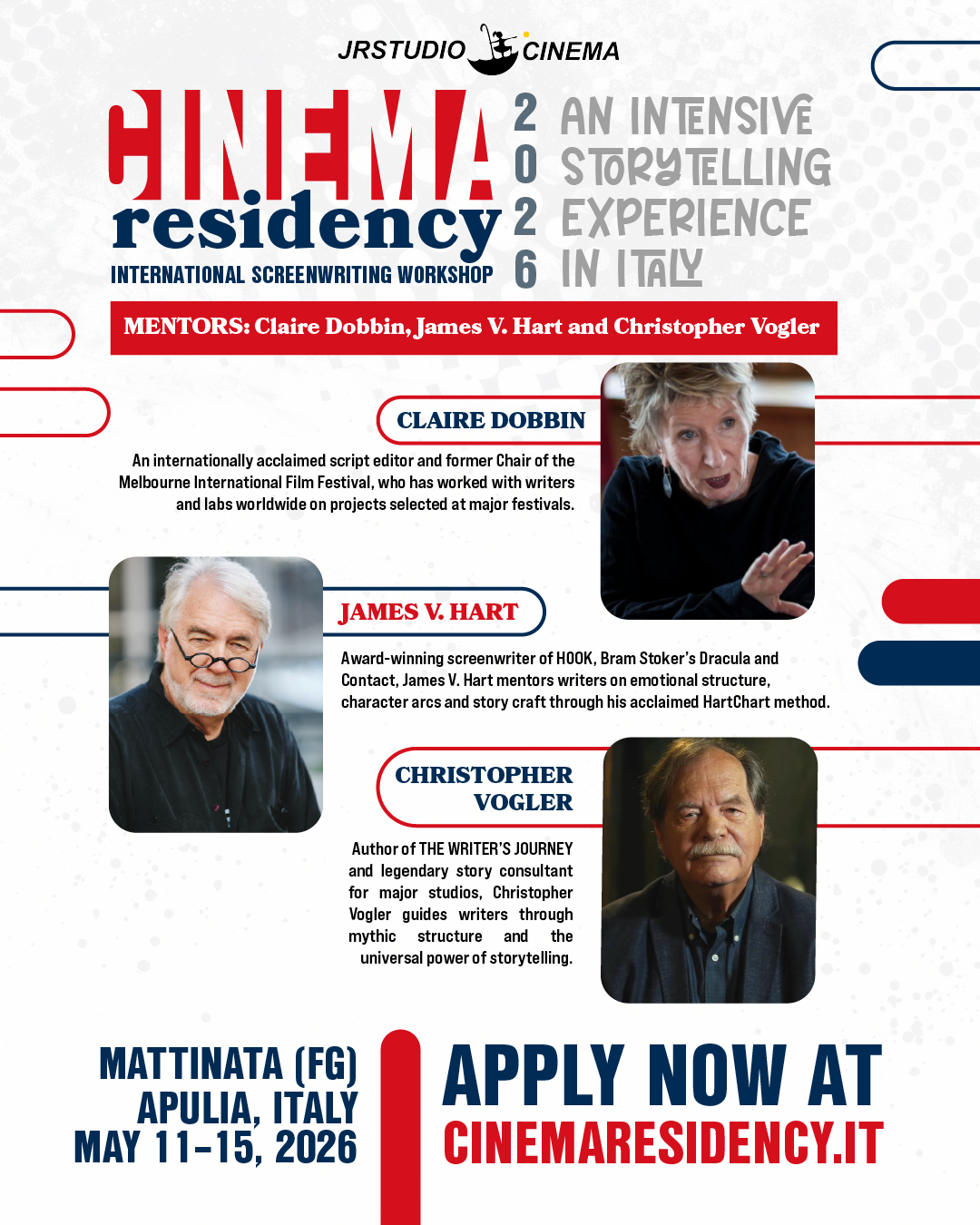 Foggia, 16 febbraio 2026 – Dal 11 al 15 maggio 2026 la Puglia ospiterà Cinema Residency 2026, un workshop internazionale di sceneggiatura rivolto a professionisti del settore, guidato da tre figure di riferimento della formazione e dello sviluppo di storie per il cinema: James V. Hart, Christopher Vogler e Claire Dobbin.