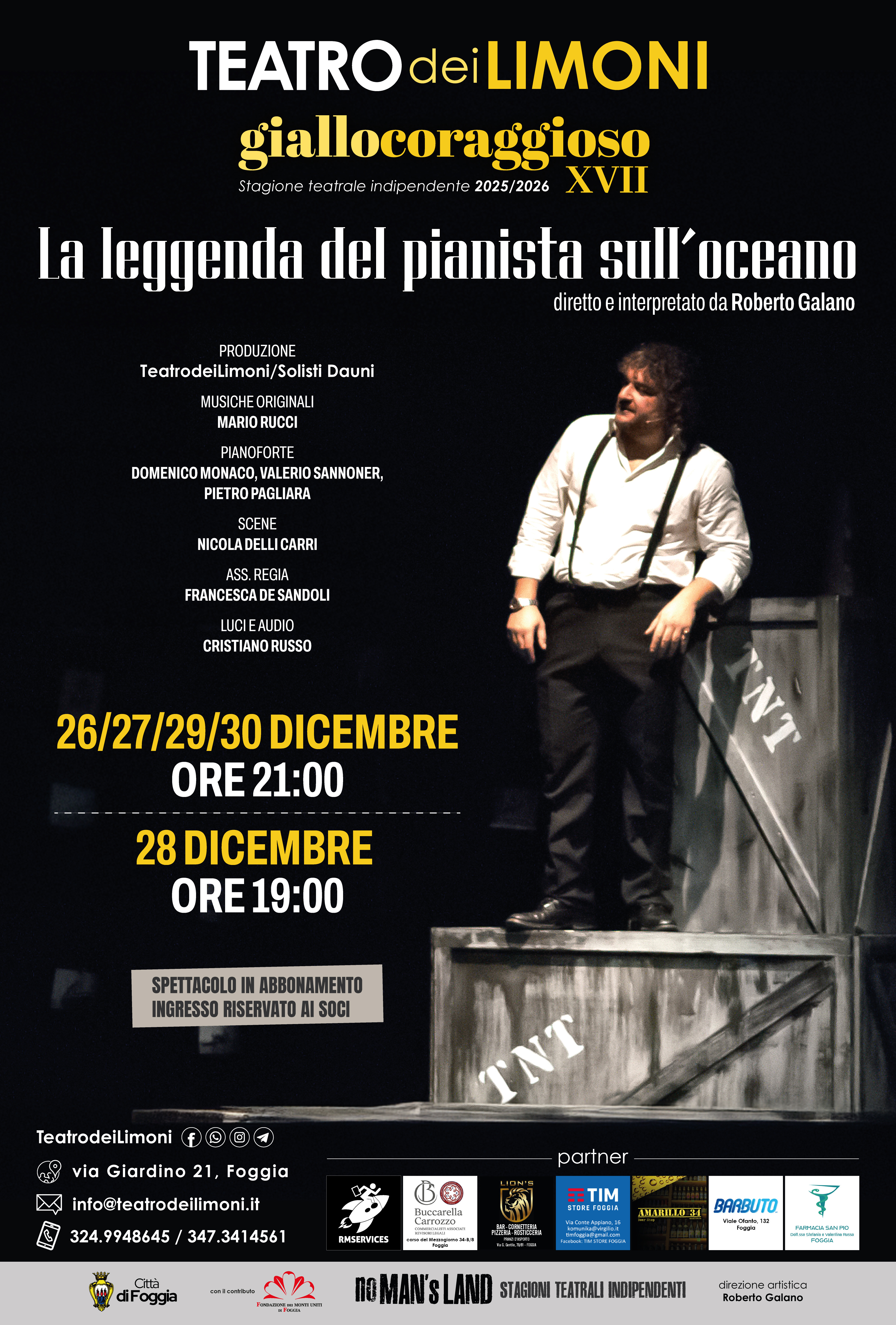 L’appuntamento natalizio con la XVII stagione teatrale GIALLOCORAGGIOSO 2025/26 sarà un classico moderno del teatro: ”La leggenda del pianista sull’oceano", interpretato e diretto da Roberto Galano.